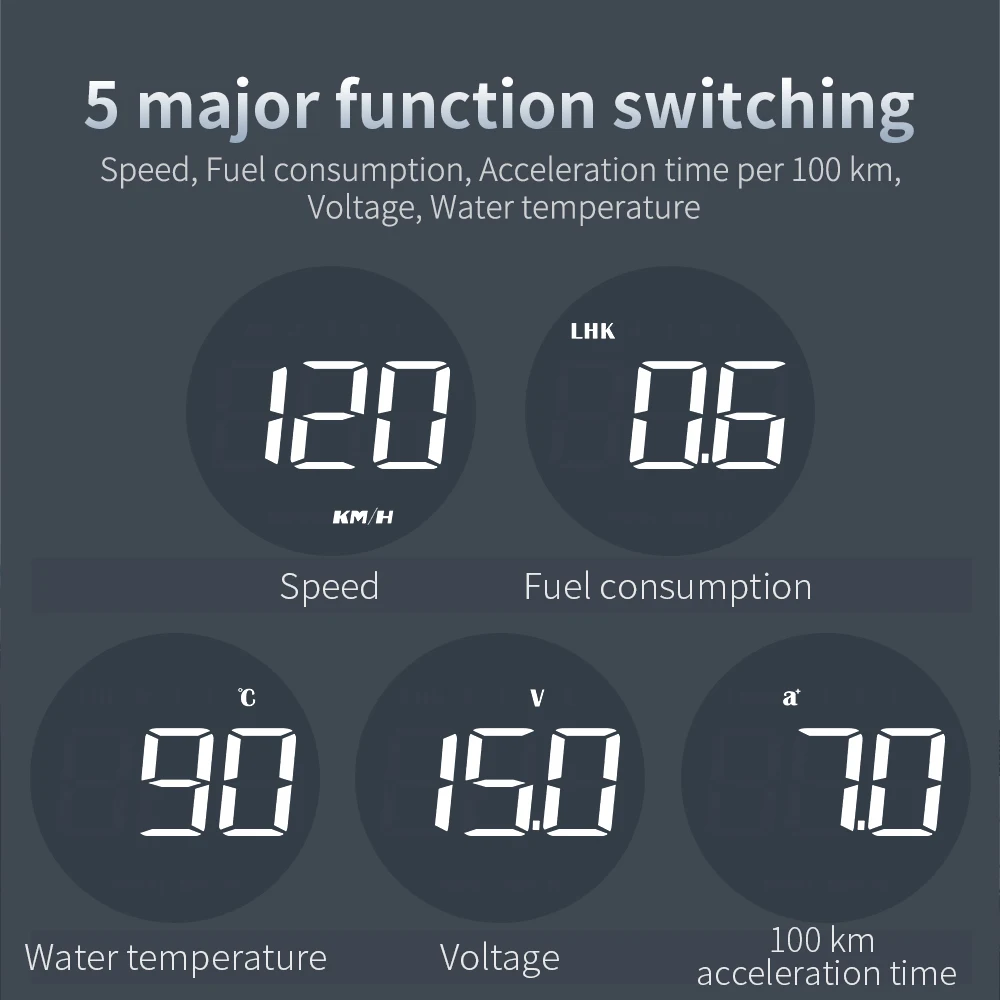 vehicle speed, water temperature, voltage, fuel consumption, 0-100km/h acceleration test.